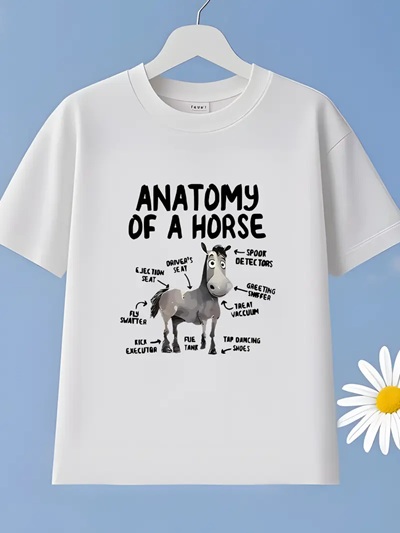 Youngsters' Funny Donkey Anatomy T-Shirt - Soft Breathable Fabric, Round Neck, Casual Short Sleeve Tee with Cartoon Horse Illustration