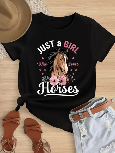 "Girl Loves Horses" Graphic Tee - Soft, Stretchy Black T-Shirt with Pink Horse & Flower Design, Casual Summer Top for Kids Aged 7-14, Outdoor Play Apparel | Playful Print Top | Comfortable Fit, Junior Clothing